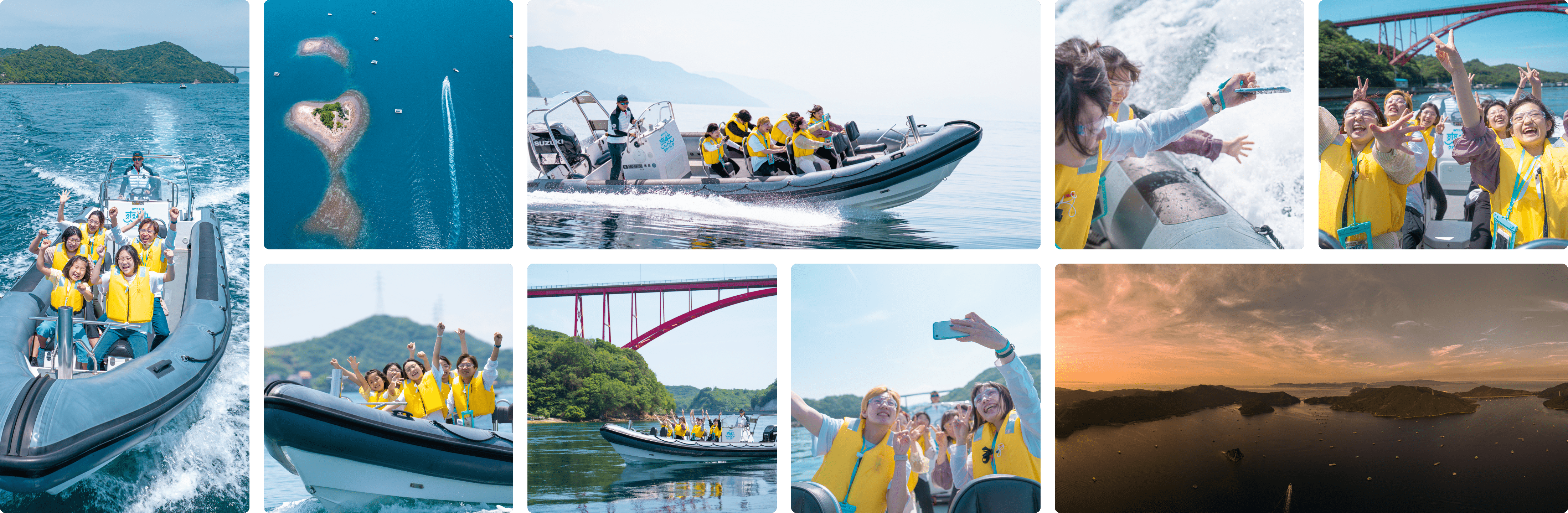 島田島・高島・大毛島の3島に囲まれた穏やかなウチノ海を周遊するこのコースでは、昔ながらの漁港の風景や、赤いアーチが特徴の小鳴門新橋など、ウチノ海ならではの美しい景色と歴史にふれることができます。渦潮だけではない鳴門の魅力をクルーズをとおして体感しつつ、リブボートのスリルと爽快感も楽しめるコースです。